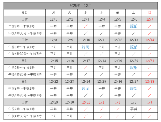 担当医や12月の診療スケジュールに関しては下記スケジュール表をご覧ください。